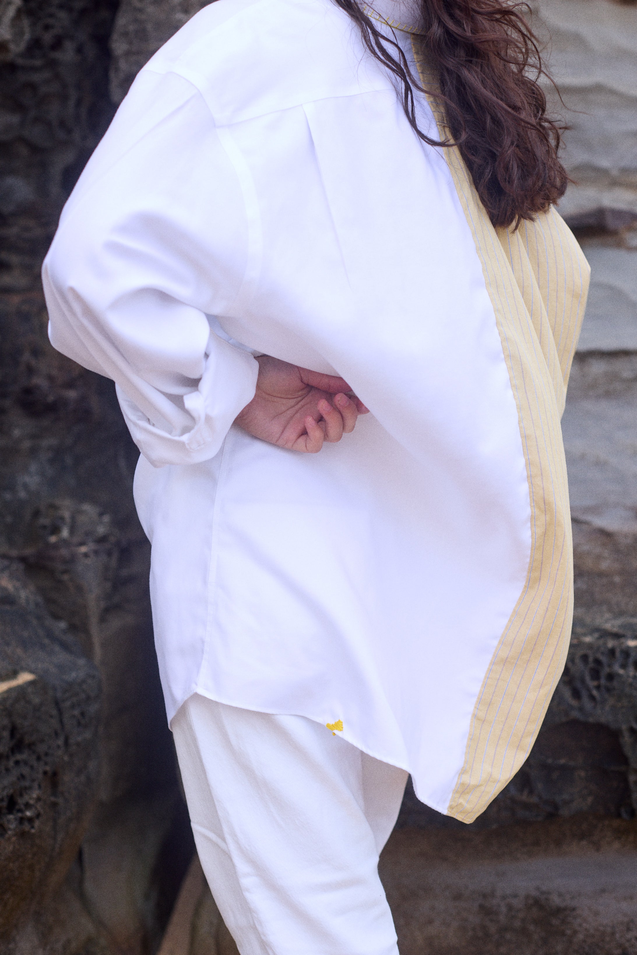 - Small hand embroidered patch on back of shirt